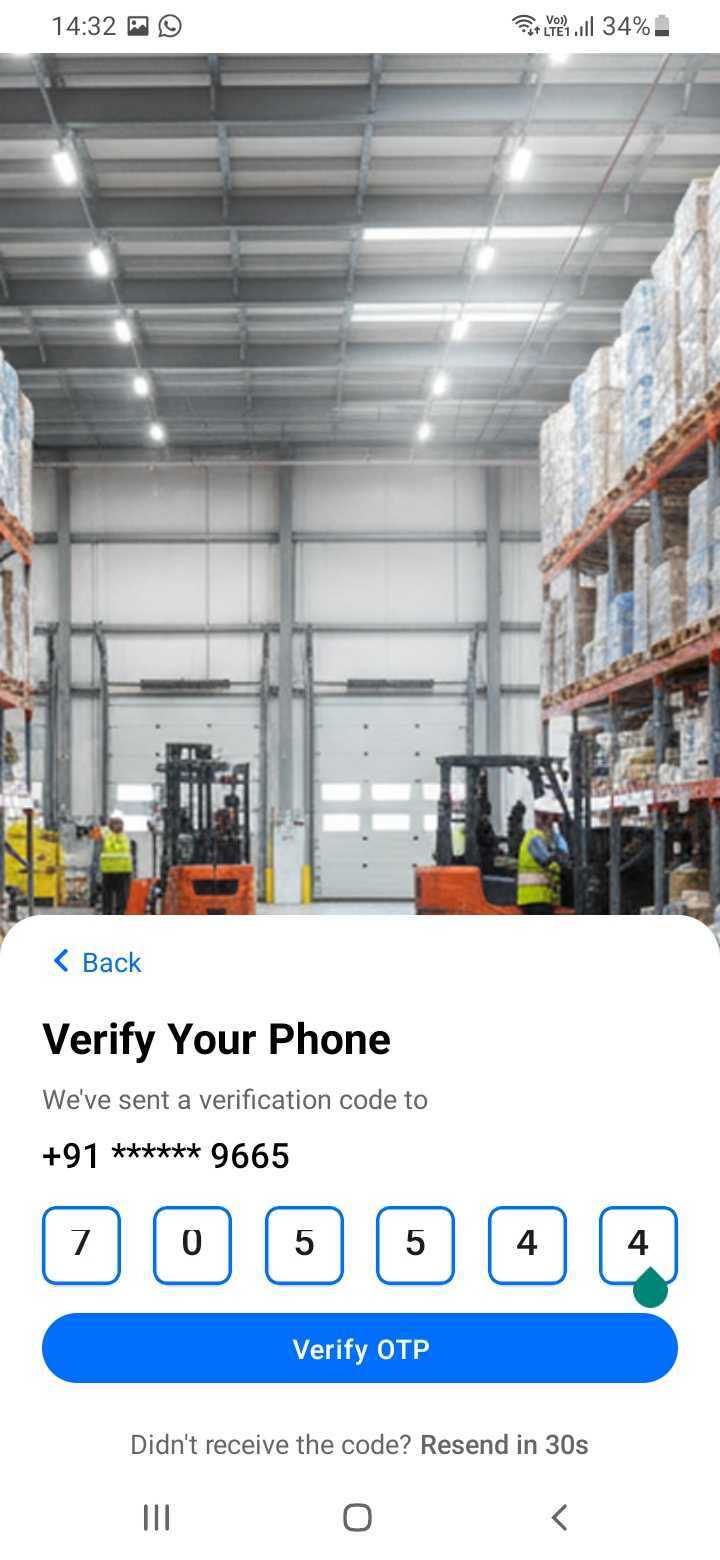 When you first open the SupplyNet app, you'll be prompted to log in using your registered phone number. After entering your phone number, you'll receive an OTP (One-Time Password) via SMS. Enter the OTP to verify your account and gain access to the application.