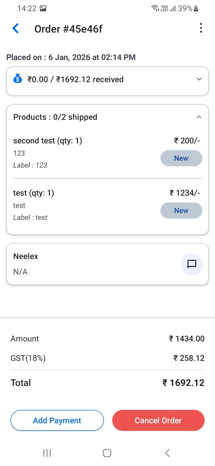 You can update individual product statuses, add notes, and track payment information from the order details screen.